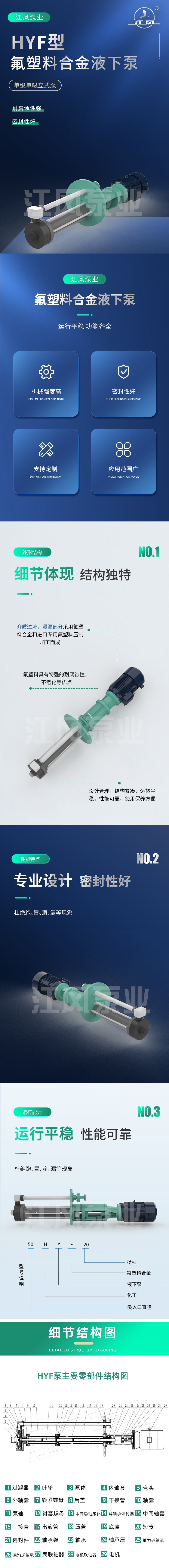 FY系列液下泵是本單位在傳統耐腐蝕液下泵基礎上融合瑞士蘇爾壽公司同類產品的先進技術,經改進設計而生產的新型泵,該泵取消了其他液下泵普遍采用的機械密封和選用了獨特結構的葉輪,使泵高效節能、無泄漏、壽命特長,從而廣泛應用于石油、化工、制藥、造紙、冶金、污水處理等行業。